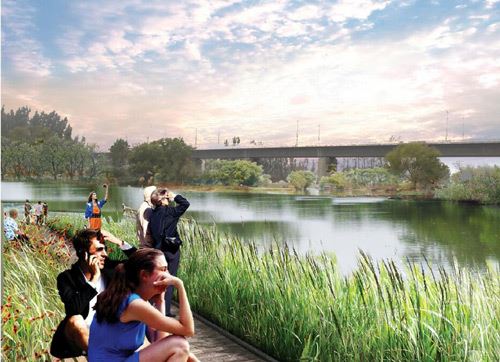 以荷花為主題,堤岸打造木棧道,河岸搭配蘆葦等植物,充分發揮綠地效益。